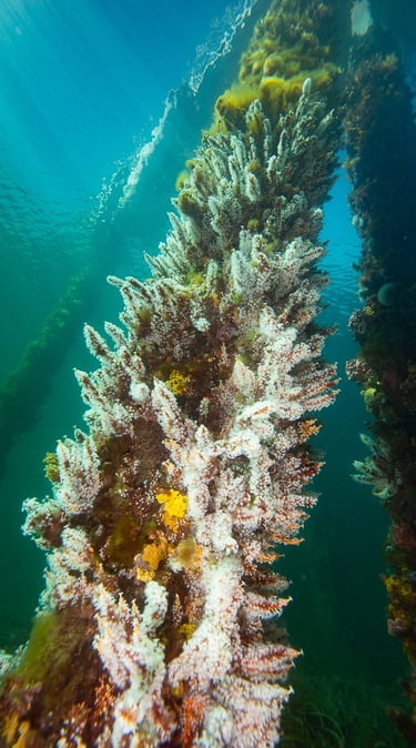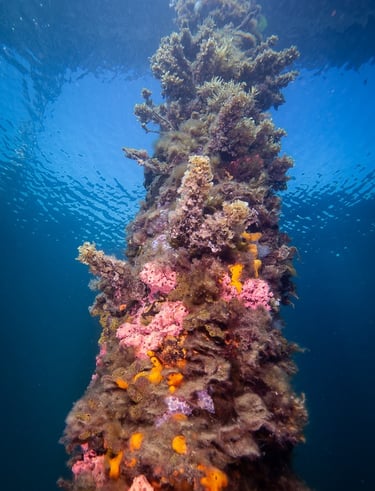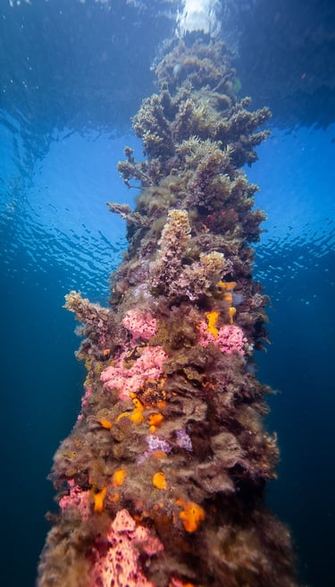 The far end of the jetty widens significantly, and this is an area where there is a lot to see for the scuba diver. Amongst the fallen jetty piles and debris of many years of storms live a huge range of critters. There are many types of nudibranchs, lots of small octopus, including the deadly blue ring, as well as some rarer species of tasselled anglers, frog fish, cuttlefish and a great variety of crab and shrimp species.